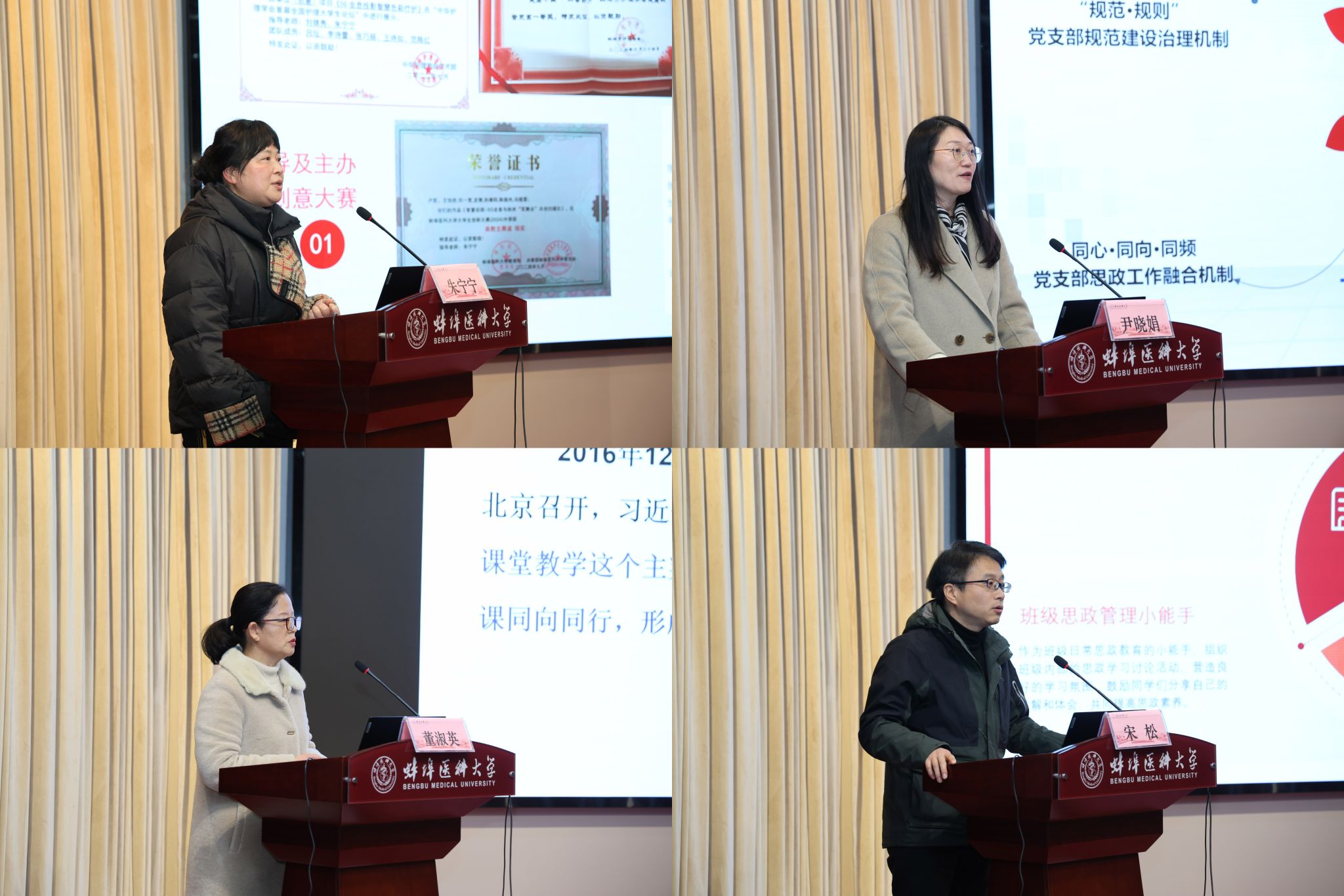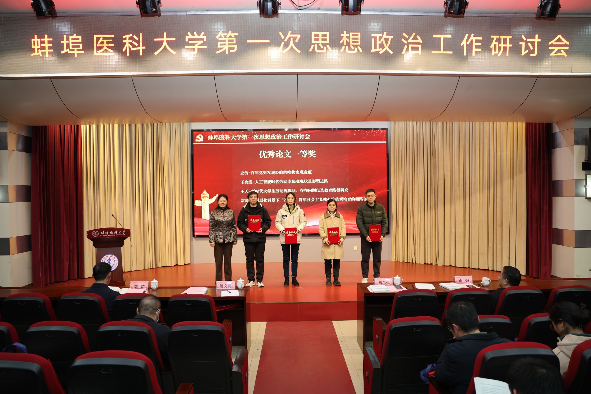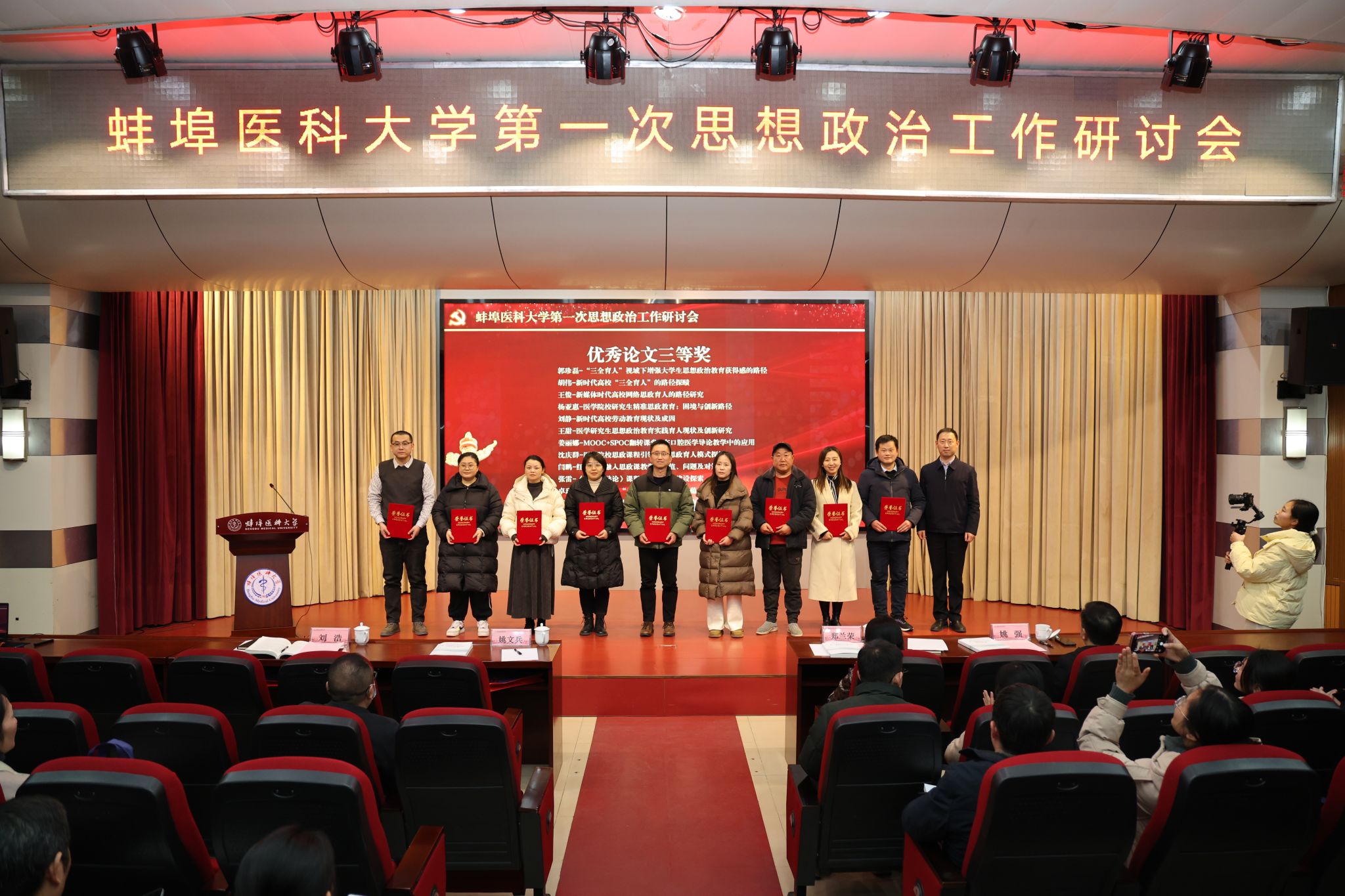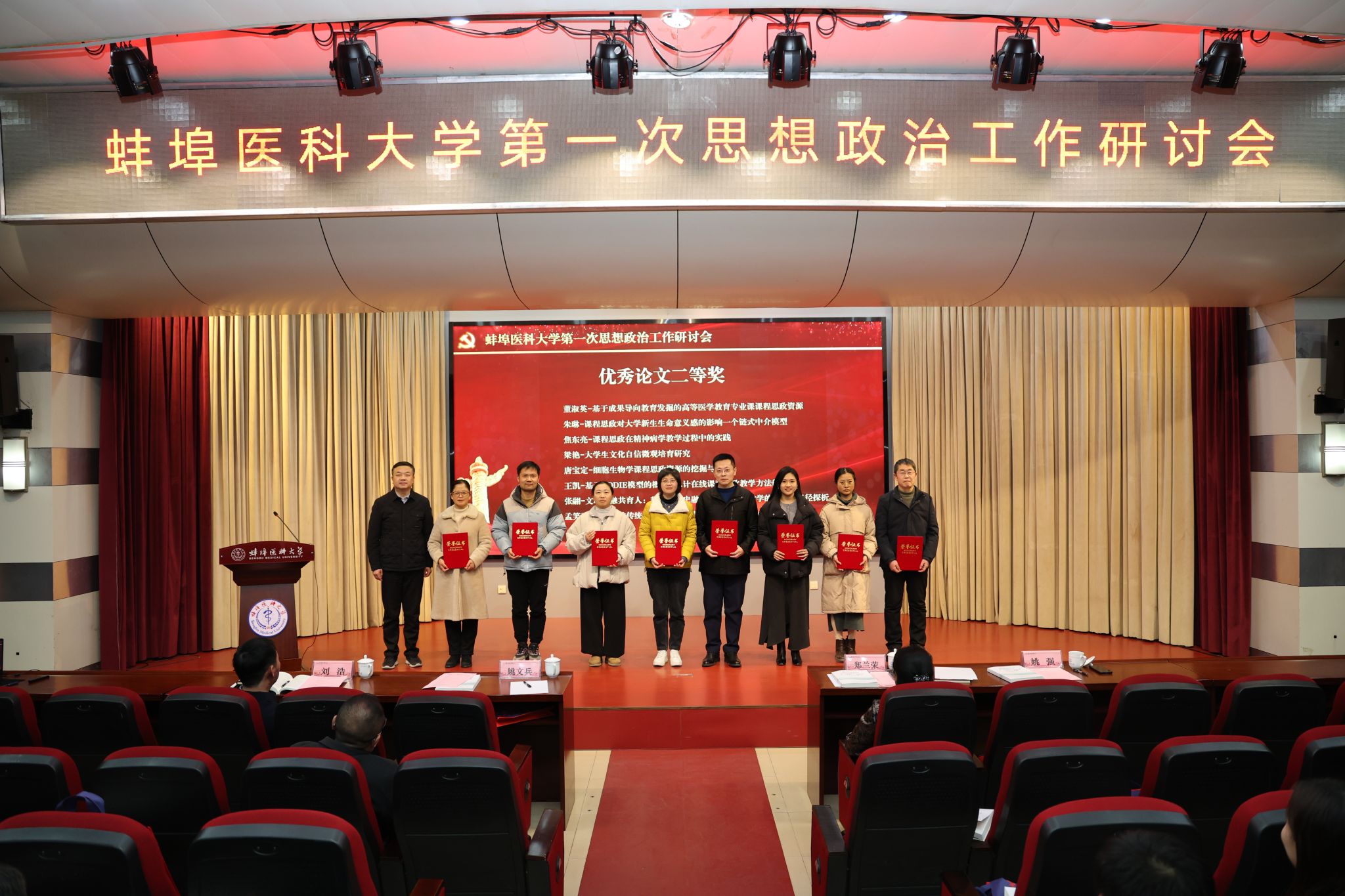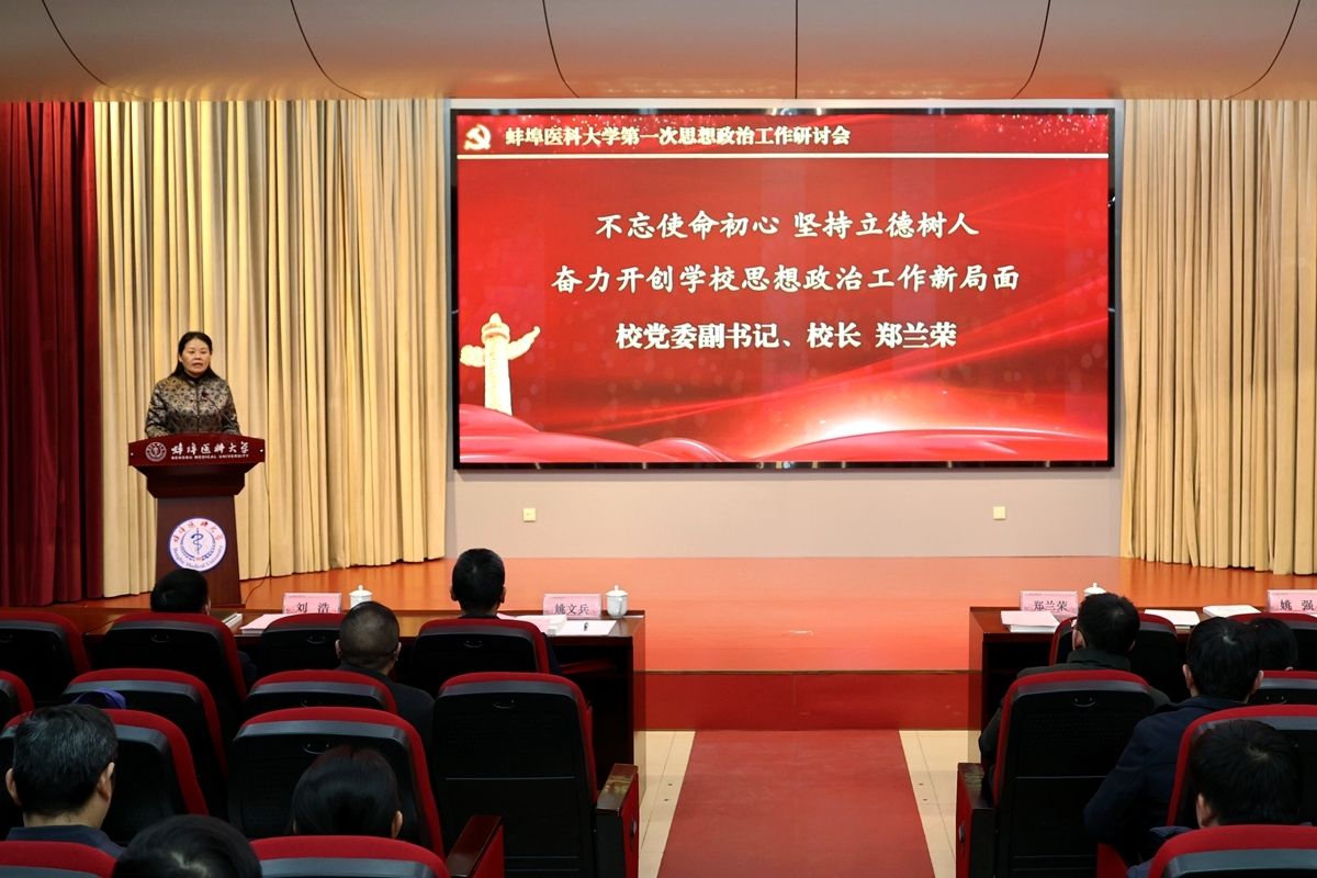 1月9日至10日,蚌埠医科大学第一次思想政治工作研讨会召开,特邀安徽师范大学马克思主义学院教授路丙辉做专题辅导。校党委副书记、校长郑兰荣以《不忘使命初心 坚持立德树人 奋力开创学校思想政治工作新局面》为题,作学校思想政治工作主题报告;校党委副书记姚文兵主持会议,校党委常委、副校长姚强、刘浩为获奖教师颁奖。各院系部党政负责人,相关职能部门负责人,马克思主义学院全体教师,全体专职辅导员,以及提交研究论文的教师、校级以上思政能力提升项目负责人参会。
